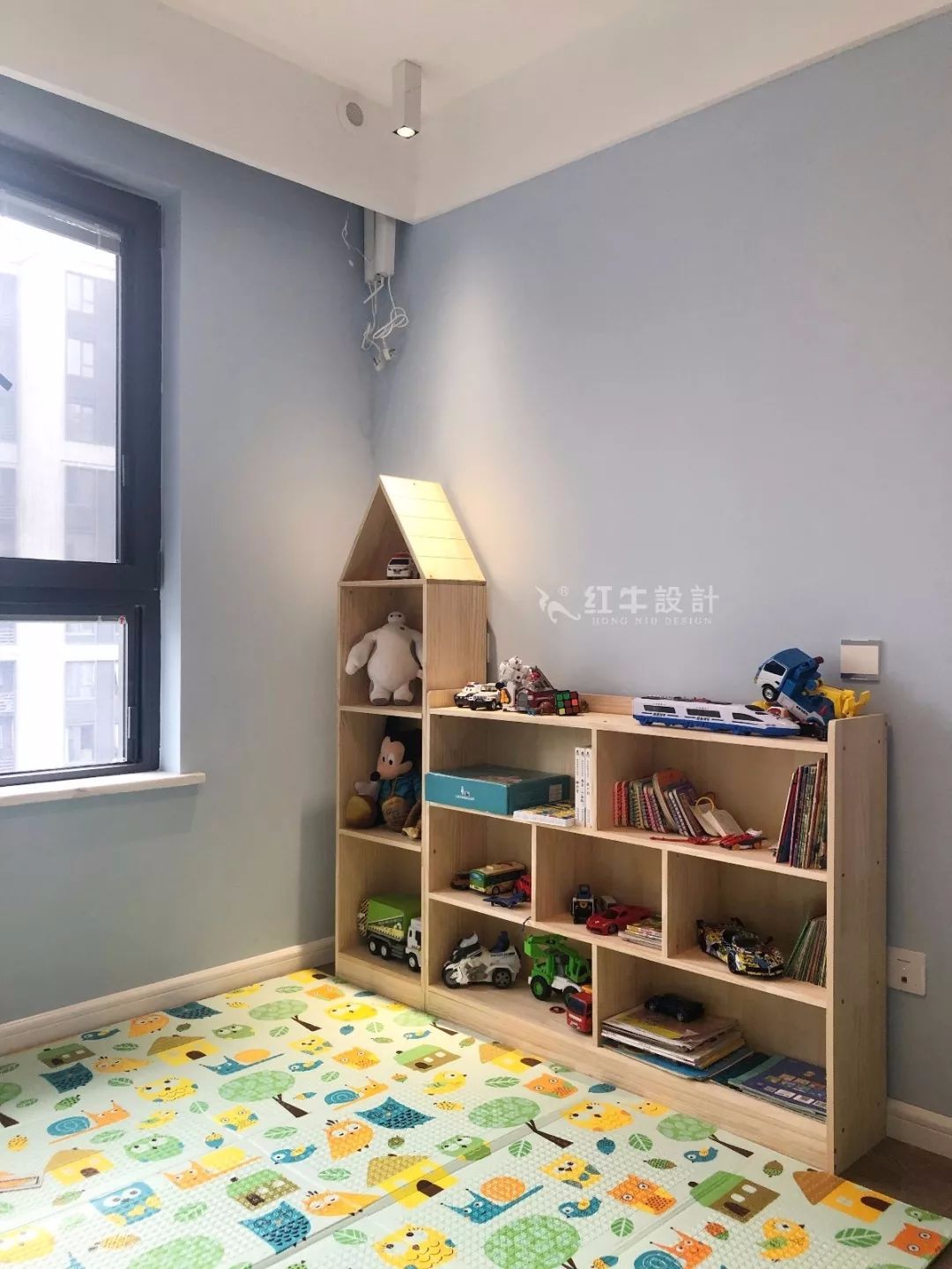 地面鋪著充滿童趣的墊子,倚墻而立的是裝滿玩具的書架,無不顯示出這是一處孩童樂園。