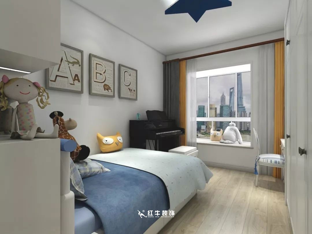 兒童房的設計很有童趣,各式各樣的卡通玩偶,星星造型的吸頂燈,裝飾畫上的ABC,無不顯示出這一特點。藍色的床品也讓空間顯得更加活潑自在。