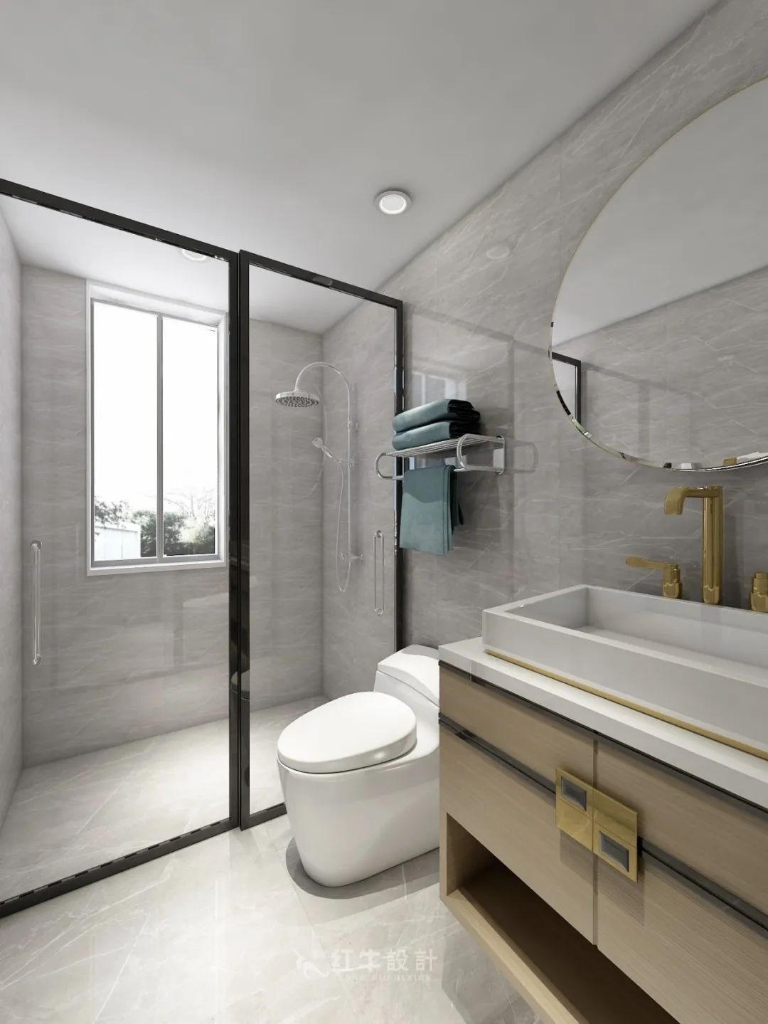 簡潔、利落的圓形鏡,打破了衛(wèi)生間的固有印象,為其添加一絲個性。顏值頗高的臺上盆,搭配黃銅龍頭,提升了空間的輕奢感。