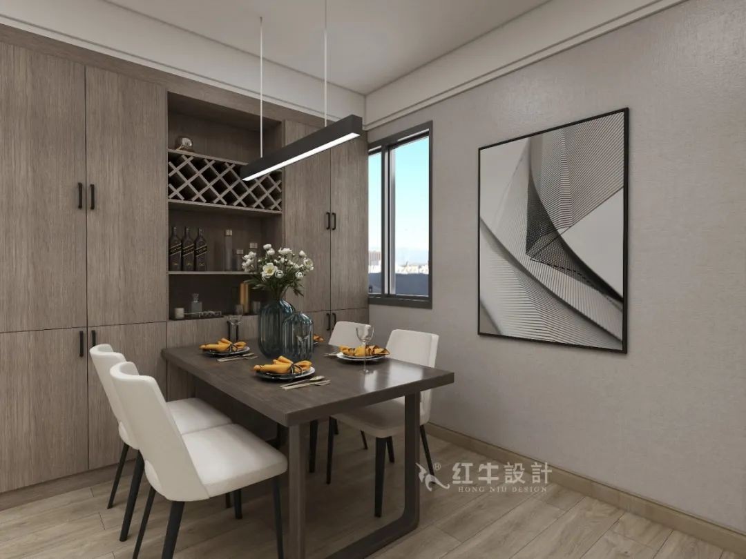客餐廳位于入戶門的兩側(cè),開門進(jìn)來可以看到對(duì)面墻上的裝飾畫組合,賞心悅目。