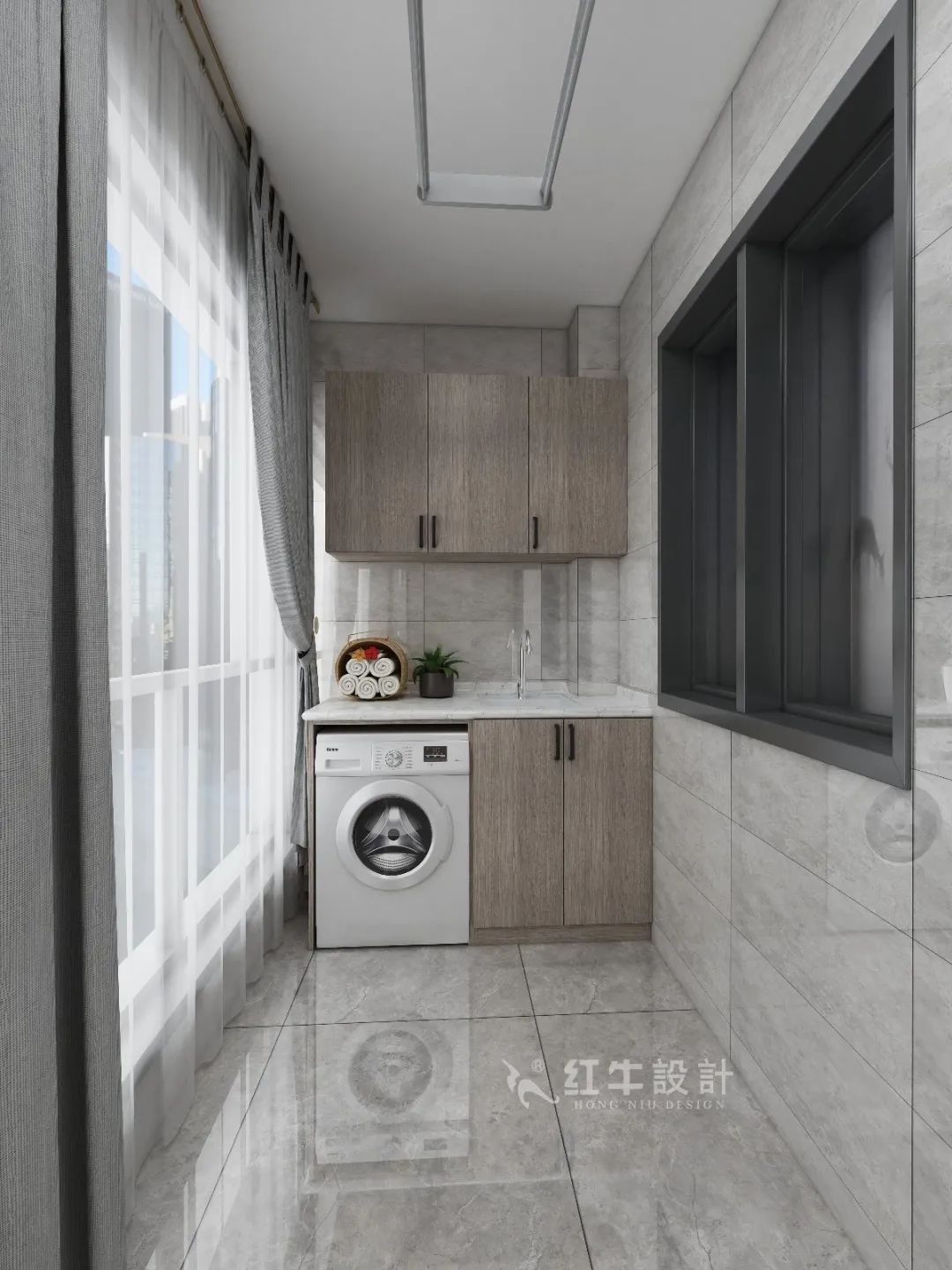 這里由原先的兩個(gè)小陽臺(tái)打通而成,實(shí)用性很強(qiáng),包含了洗衣、晾曬、收納等諸多功能。