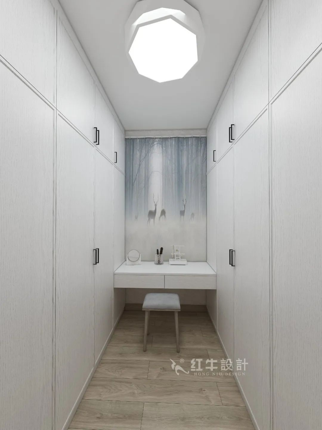 書房旁邊是衣帽間,定制純白衣櫥、化妝臺(tái),搭配木質(zhì)地板,顯得清新自然。化妝、更換衣服全部能在這個(gè)房間里面搞定。