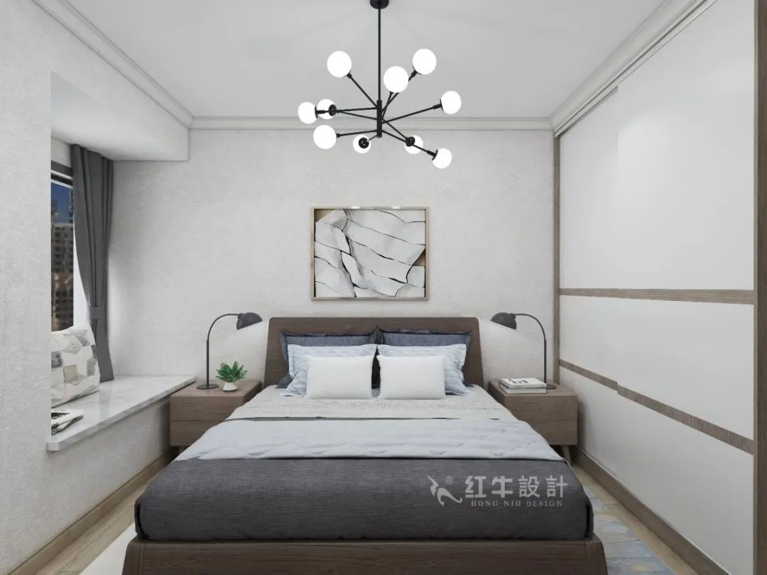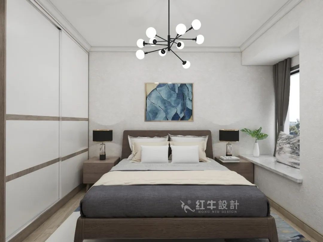 臥室呈現(xiàn)對(duì)稱性,床的兩側(cè)保持平衡。選用推拉門衣柜,不占空間,還給人一種簡(jiǎn)潔明快的感覺。