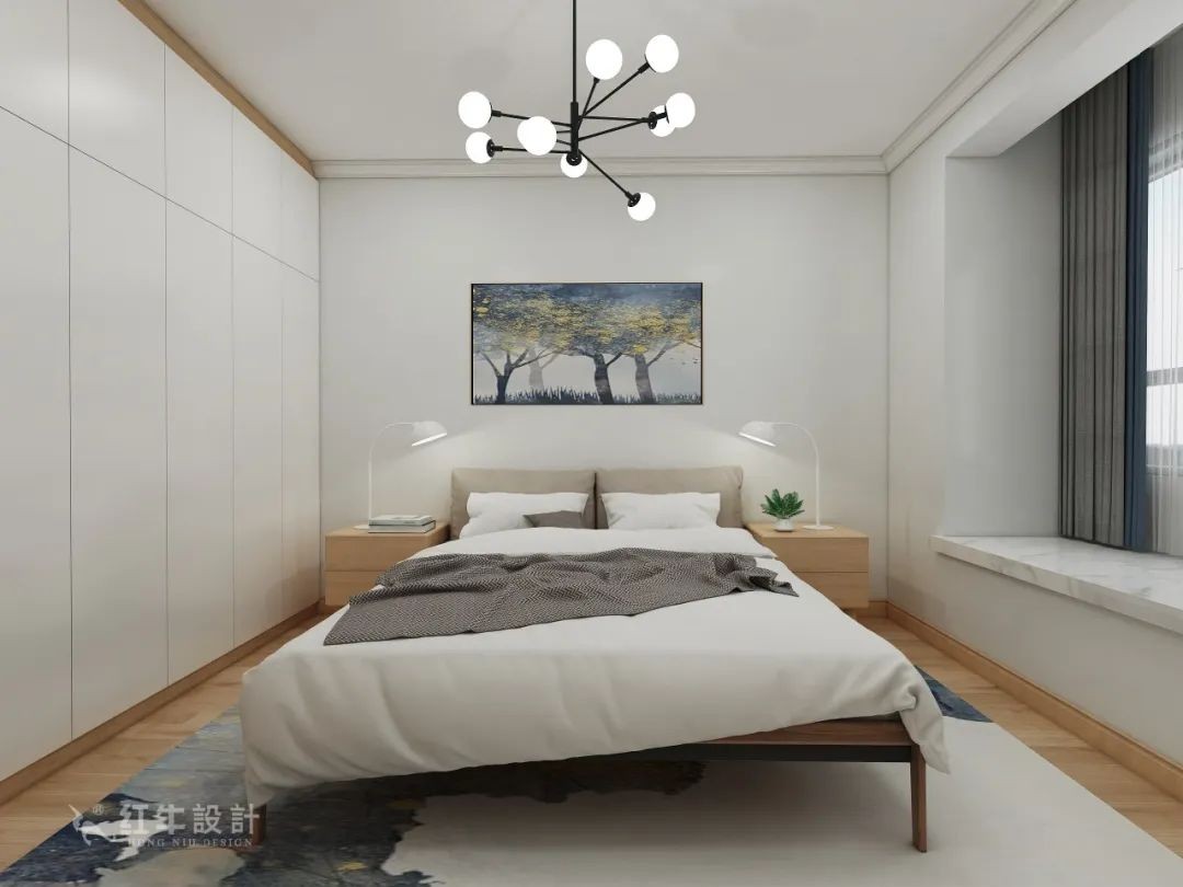 臥室的大面積白色讓空間更顯干凈明朗,搭配北歐風家具及燈飾,清新怡人。裝飾畫讓墻面不再單調,還能體現(xiàn)北歐風接近自然的特點。