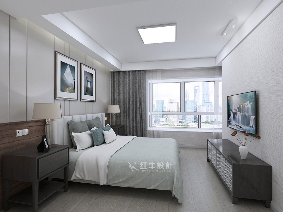 主臥室光線充足,180度全景大飄窗,衣帽間的設計,不單要滿足客戶的儲藏空間,還要有梳妝臺的功能。其它整體空間基本合理,以通透性、實用性、舒適性為主要設計思路??蛻粝矚g現(xiàn)代風格,但是不喜歡太單調(diào)的東西,定位后現(xiàn)代的風格,客廳背景有一個到次臥室的門,設計成了隱形門,電視背景墻形成了一個整體,兩邊是框架線條加上硬包,中間鑲嵌銅條,節(jié)約大氣。