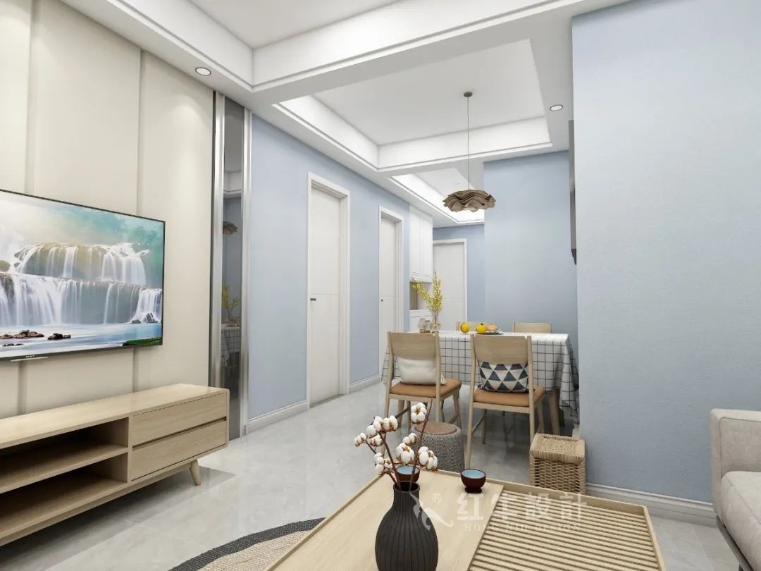 因為把整個墻體往前拉平了,為了不讓整個空間顯得擁擠,所以在進(jìn)門的盡頭設(shè)計了一個端景柜,增加層次感和空間進(jìn)深感。