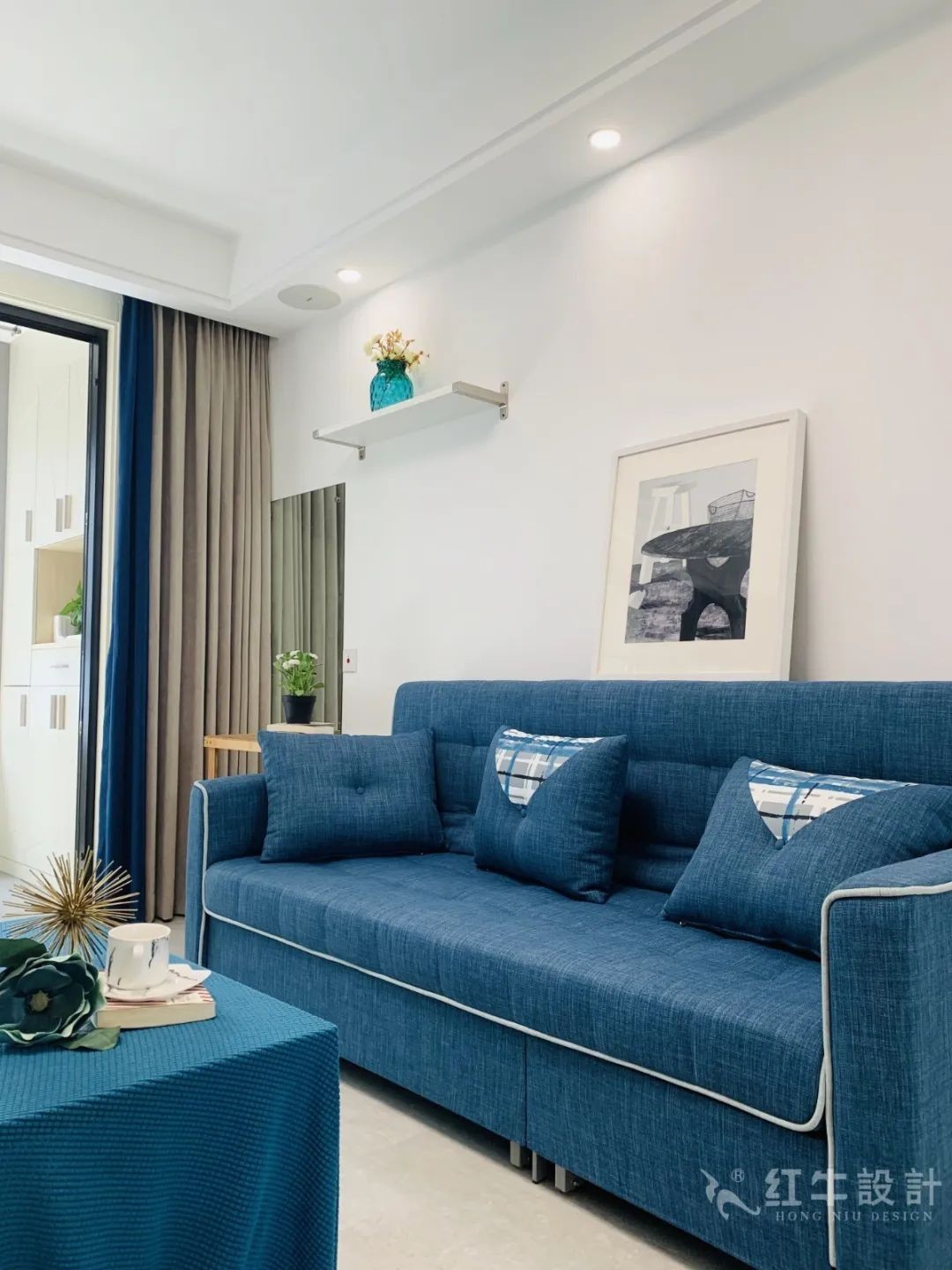 深藍色的布藝沙發(fā)特別吸晴,豐富了整個空間的配色。