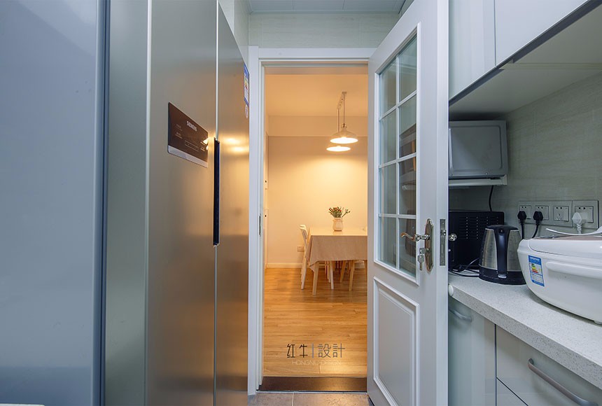 2.由于廚房的開間比較小,只夠做一個(gè)L型的柜子,再加上要放雙門冰箱,廚柜操作臺(tái)面特別小,所以把衛(wèi)生間和廚房的中間墻體拆掉,縮小的衛(wèi)生間的開間,擴(kuò)大了廚房的空間,增出了很多臺(tái)面。