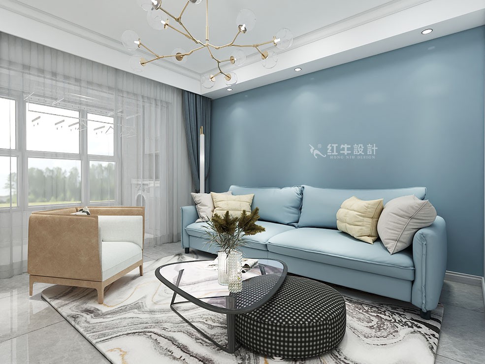 本案以輕松愉悅的北歐風(fēng)設(shè)計感與溫馨家的氛圍為出發(fā)點(diǎn),公共區(qū)域客廳用霧霾藍(lán)背景墻,與其他區(qū)域形成鮮明對比,著重空間視覺重點(diǎn)。私密區(qū)域,次臥增加梳妝臺,床頭一側(cè)的小吊燈,不對稱的設(shè)計,不拘一格。兒童房榻榻米,與淡黃色的乳膠漆,顯得空間童趣又具有足夠的儲藏空間。整體營造北歐風(fēng)與溫馨家的氛圍。