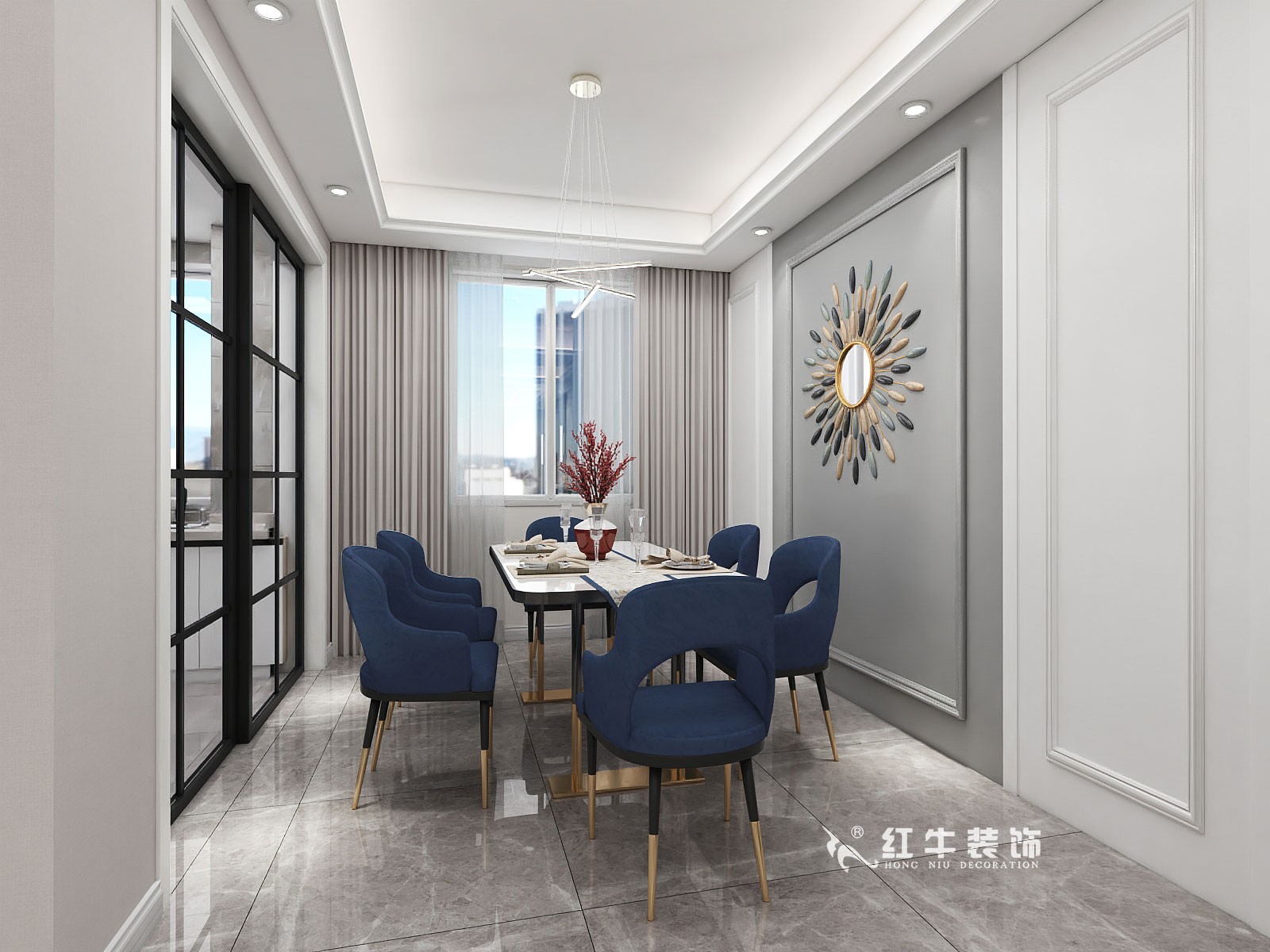 深藍(lán)色的餐椅特別吸晴,與大理石餐桌相結(jié)合,給人一種優(yōu)雅輕奢的感覺。墻上包含鏡子的裝飾很有特色,還能增加空間層次感。