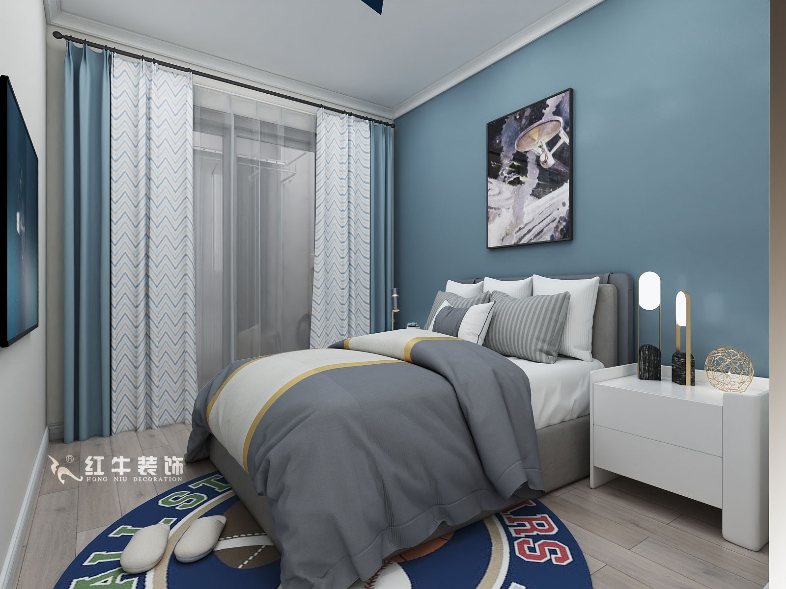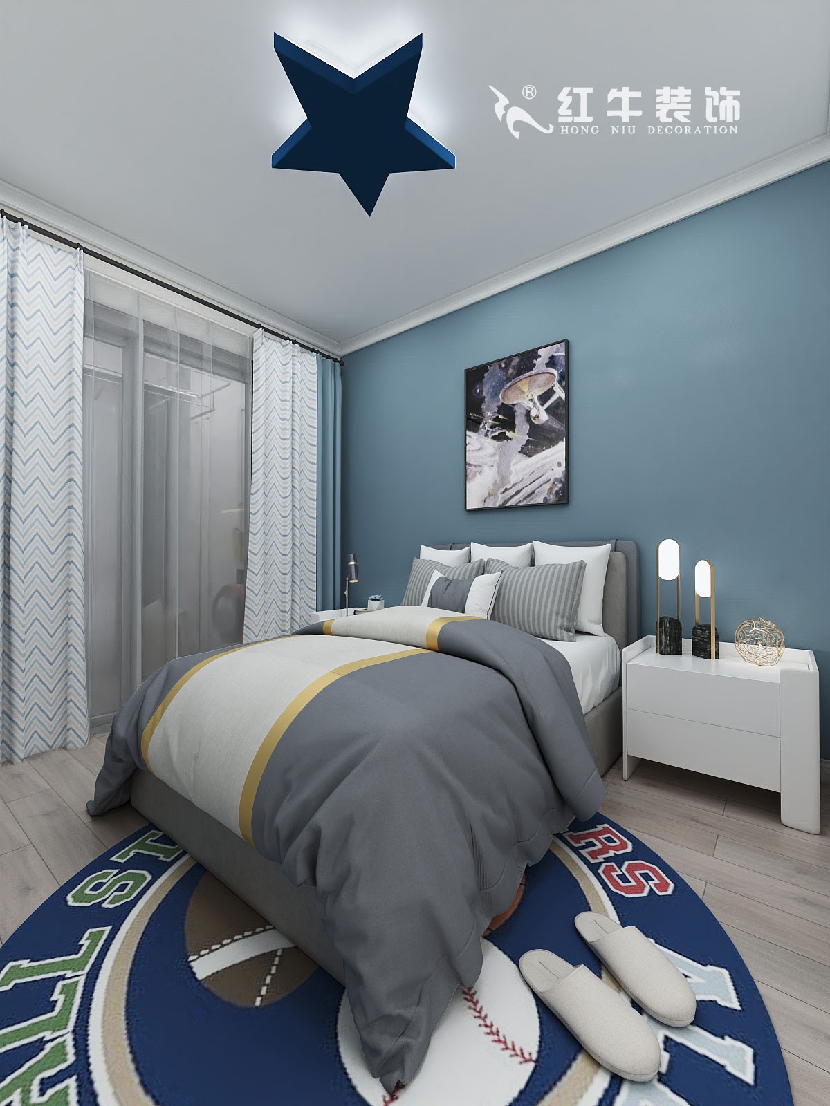 藍(lán)色系的背景墻,洋溢著清新與活力。此外,圓形的地毯、雙色拼接的窗簾、五角星形狀的吸頂燈,都包含了深淺不一的藍(lán)色,匯聚一堂,打造出清爽自然的臥室空間。