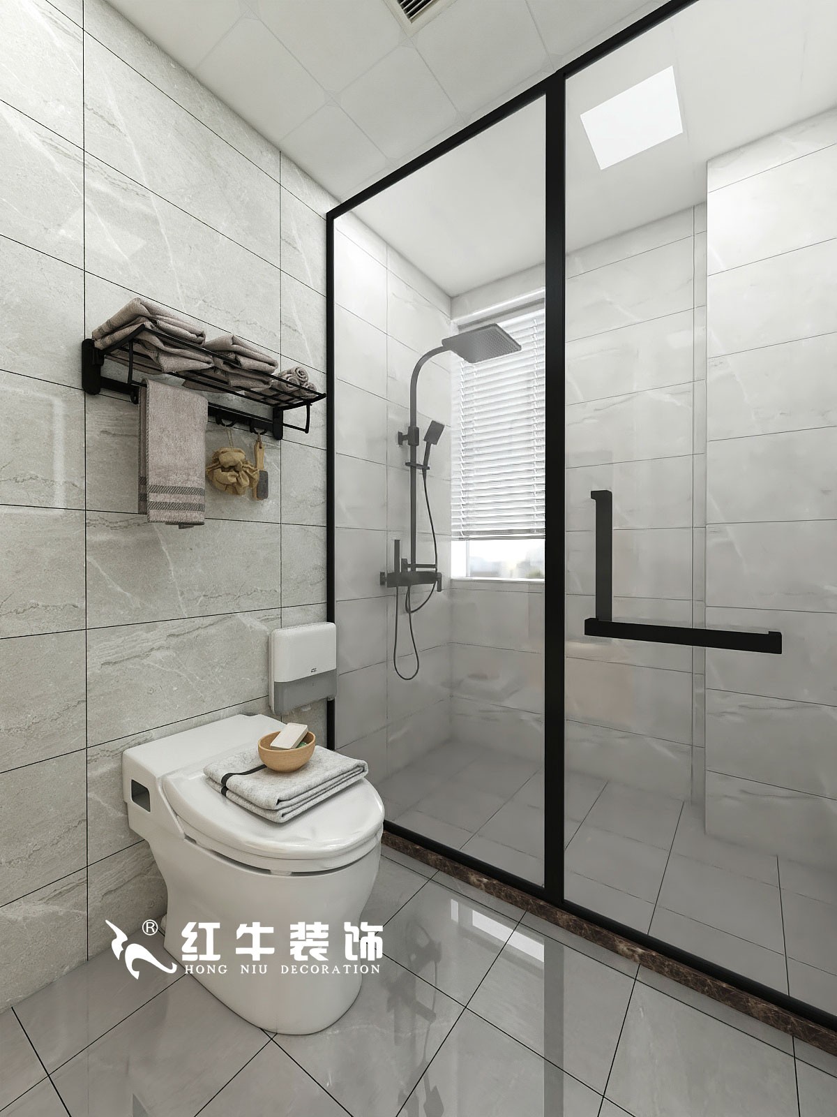 黑色邊框淋浴房加黑色的五金件,與墻地面形成對(duì)比,整體比較耐看。同樣材質(zhì)的置物架很好地利用了馬桶上方的位置,平時(shí)可以用來放置浴巾、懸掛毛巾。