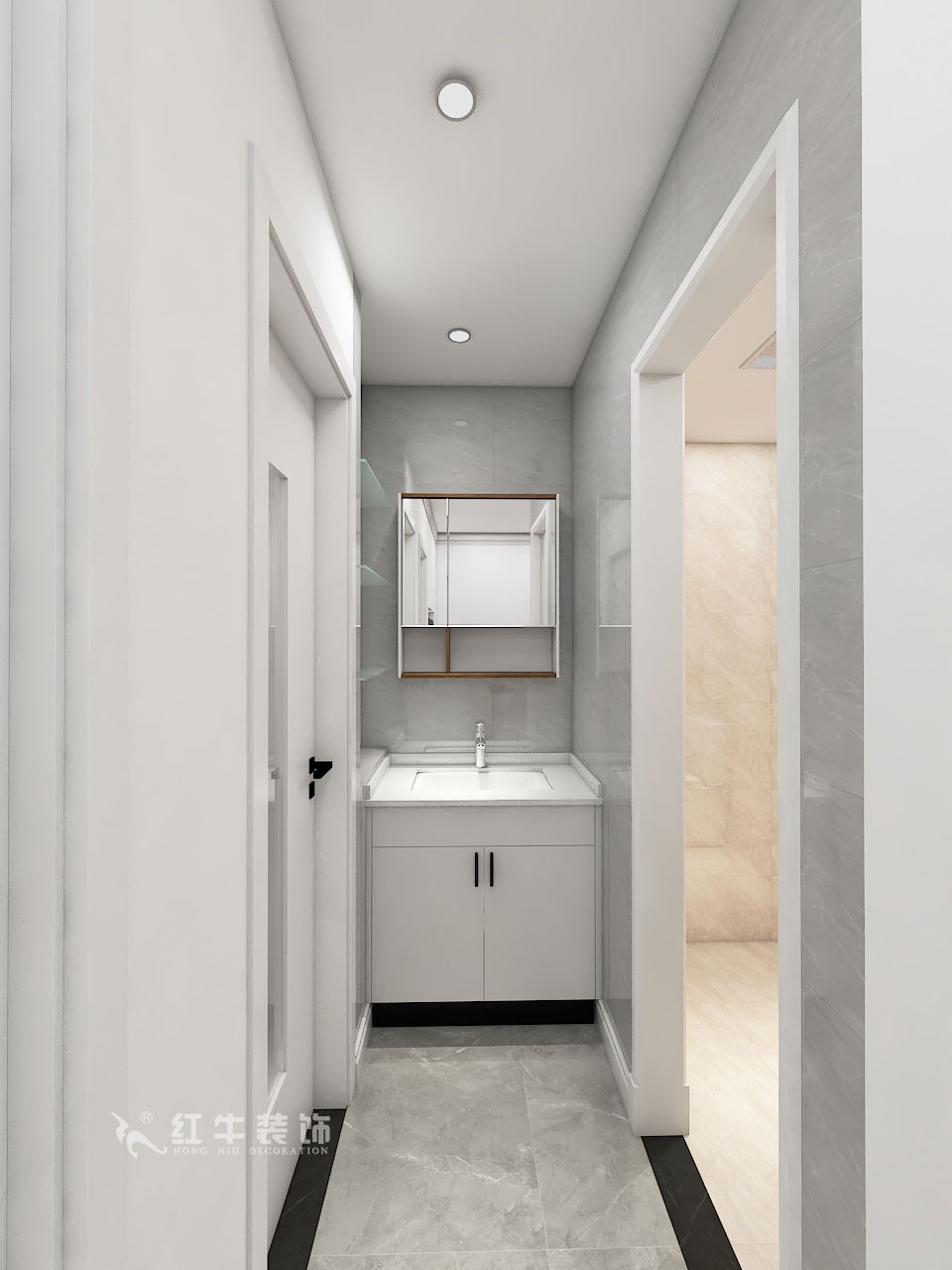 本案設(shè)計(jì)業(yè)主老人及孫女同住,年齡跨度較大,所以采用白墻,木色的現(xiàn)代風(fēng),兩代都適合。地面灰色瓷磚,亮度不受影響。墻面木色背景墻增加溫馨的感覺。鏡面點(diǎn)綴使空間得以延伸。