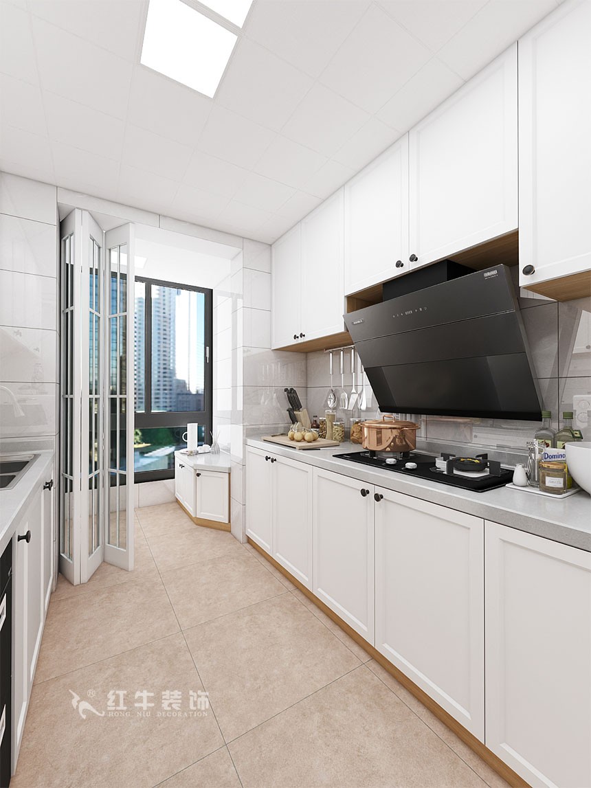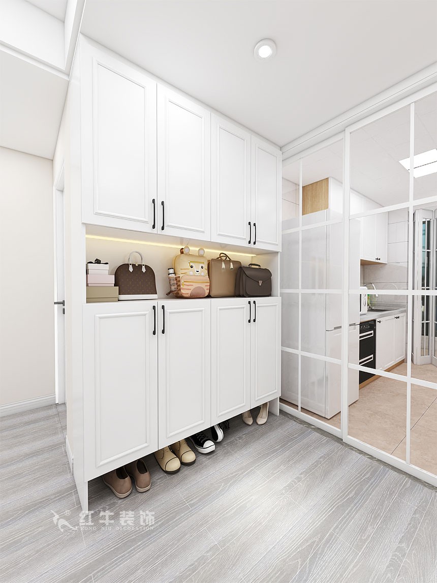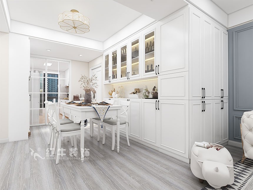 業(yè)主是一家三口居住,整體的風(fēng)格最終確定為簡歐風(fēng)格,考慮到南邊陽臺(tái)需要洗曬,利用北陽臺(tái)作為了吸煙區(qū),平時(shí)可以和廚房一起使用,吸煙時(shí)關(guān)上透明的折疊門,合理的利用了北陽臺(tái)。關(guān)于儲(chǔ)物空間,客廳比較大,利用了客廳的空間做了一些儲(chǔ)物空間。