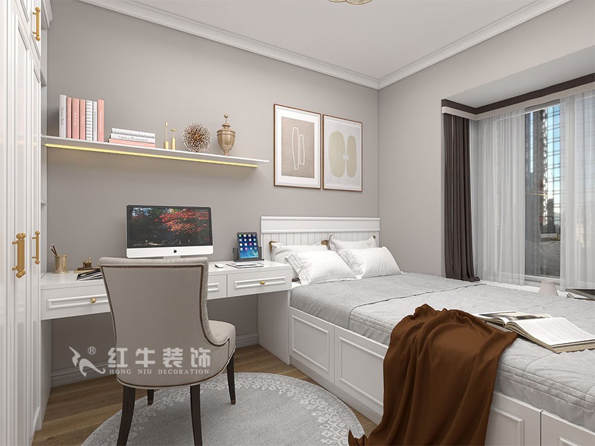 整體風(fēng)格簡(jiǎn)約,白色和木紋色營(yíng)造出溫馨的生活氣息,次臥室設(shè)計(jì)了組合柜,既有學(xué)習(xí)的區(qū)域同時(shí)也兼顧了休閑空間。