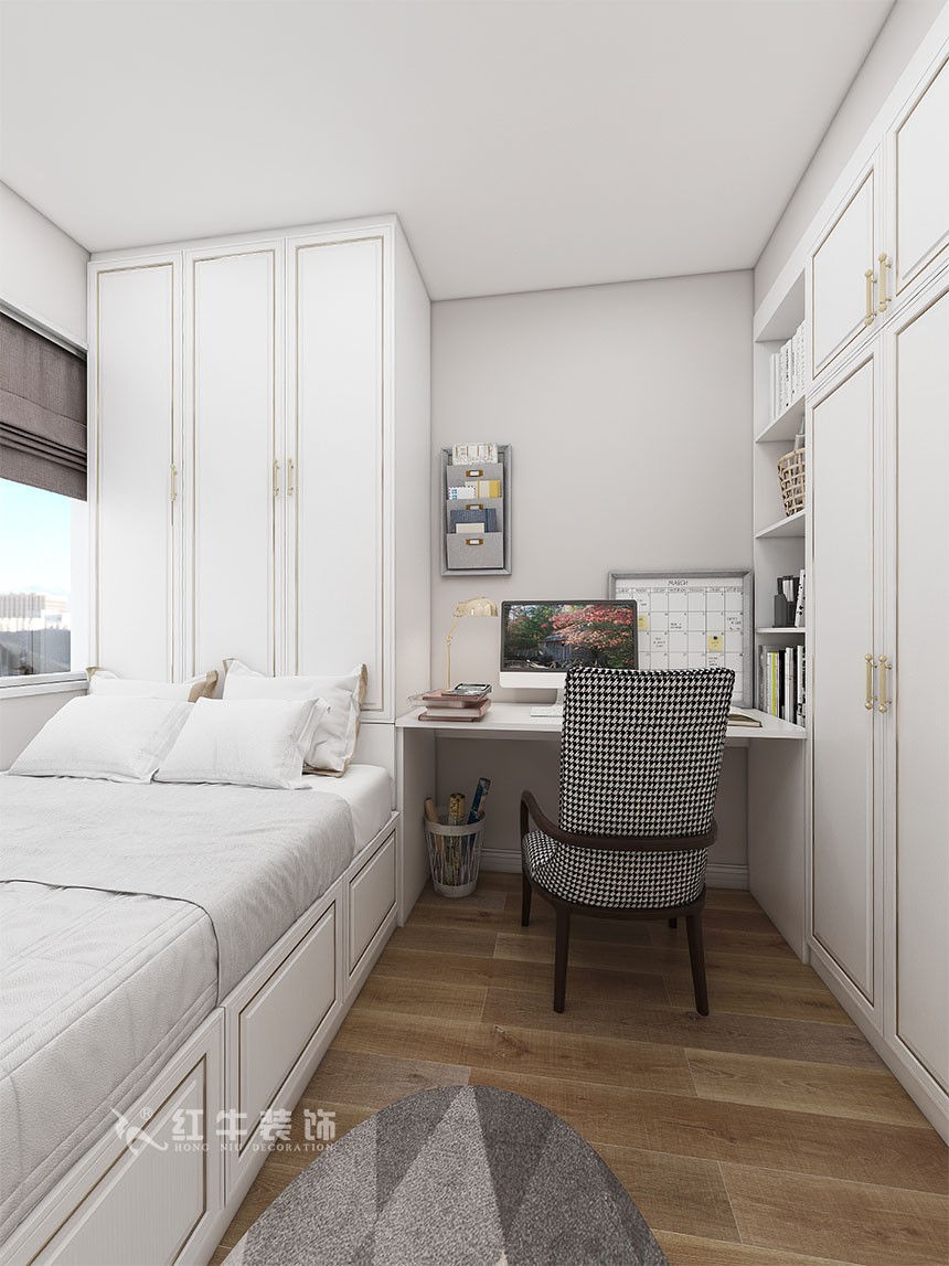 整體風(fēng)格簡約,白色和木紋色營造出溫馨的生活氣息,運(yùn)用金色拉絲不銹鋼線條營造空間層次感,提升空間。營造輕奢溫馨的居家環(huán)境。次臥室設(shè)計(jì)了組合柜,既有學(xué)習(xí)的區(qū)域同時也兼顧了休閑空間。