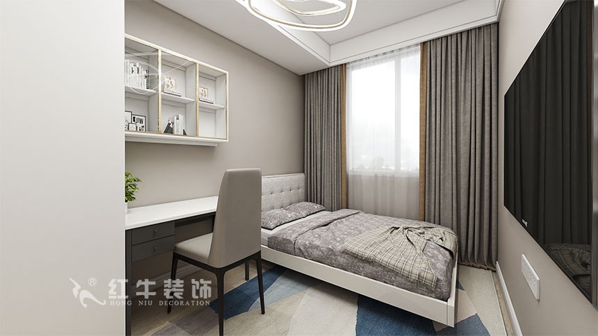 整體風(fēng)格簡(jiǎn)約,白色和淺灰色營(yíng)造出溫馨的生活氣息,次臥室設(shè)計(jì)了組合柜,既有學(xué)習(xí)的區(qū)域同時(shí)也兼顧了休閑空間。