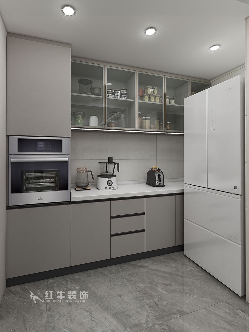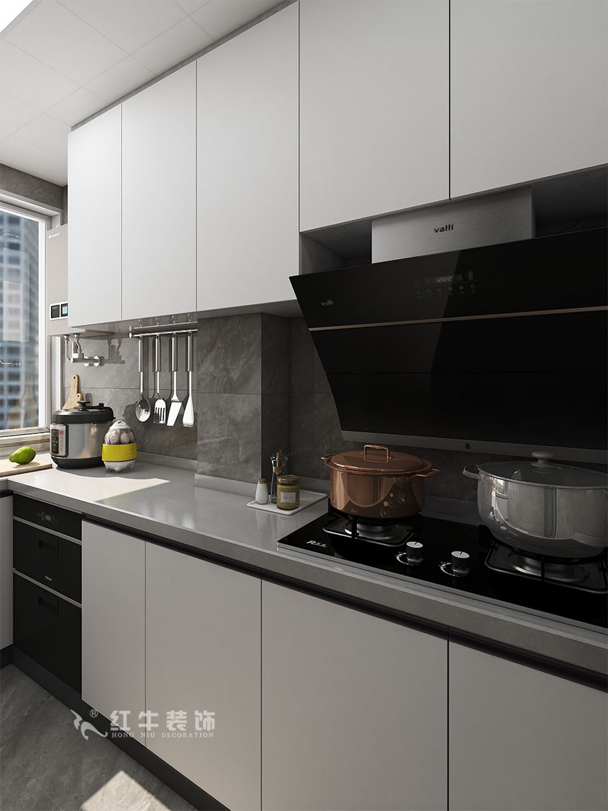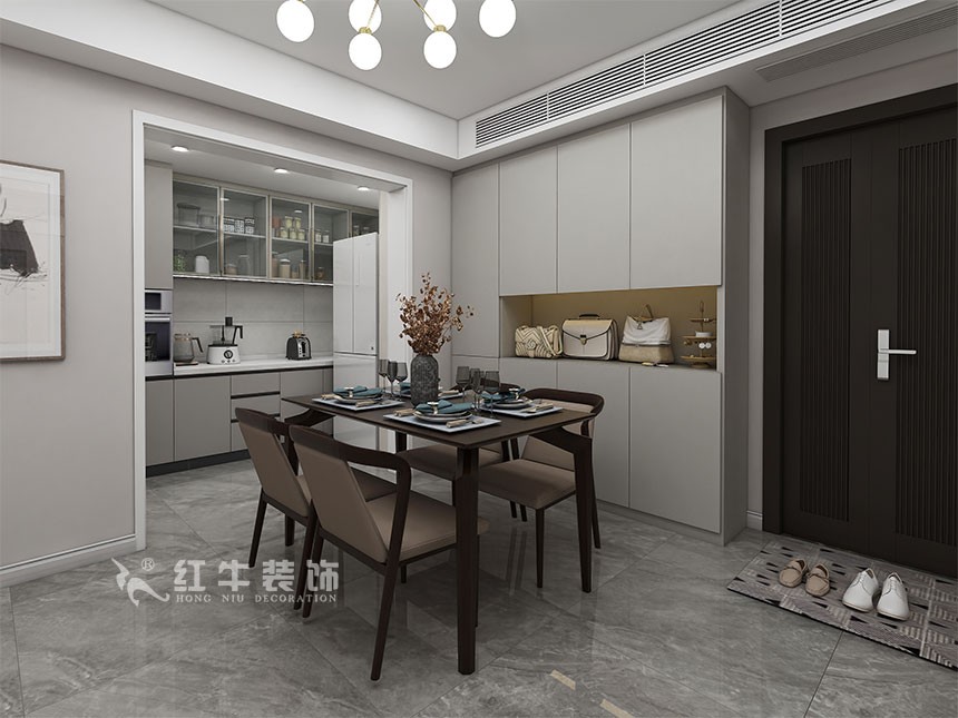 在整個(gè)客餐廳的空間設(shè)計(jì)方面,摒棄了應(yīng)有的理想方案,采用大膽的手法將廚房空間進(jìn)行了中西廚的劃分,融入進(jìn)了整個(gè)公共空間,實(shí)用的同時(shí)又能體現(xiàn)現(xiàn)代簡(jiǎn)約的整體感官。