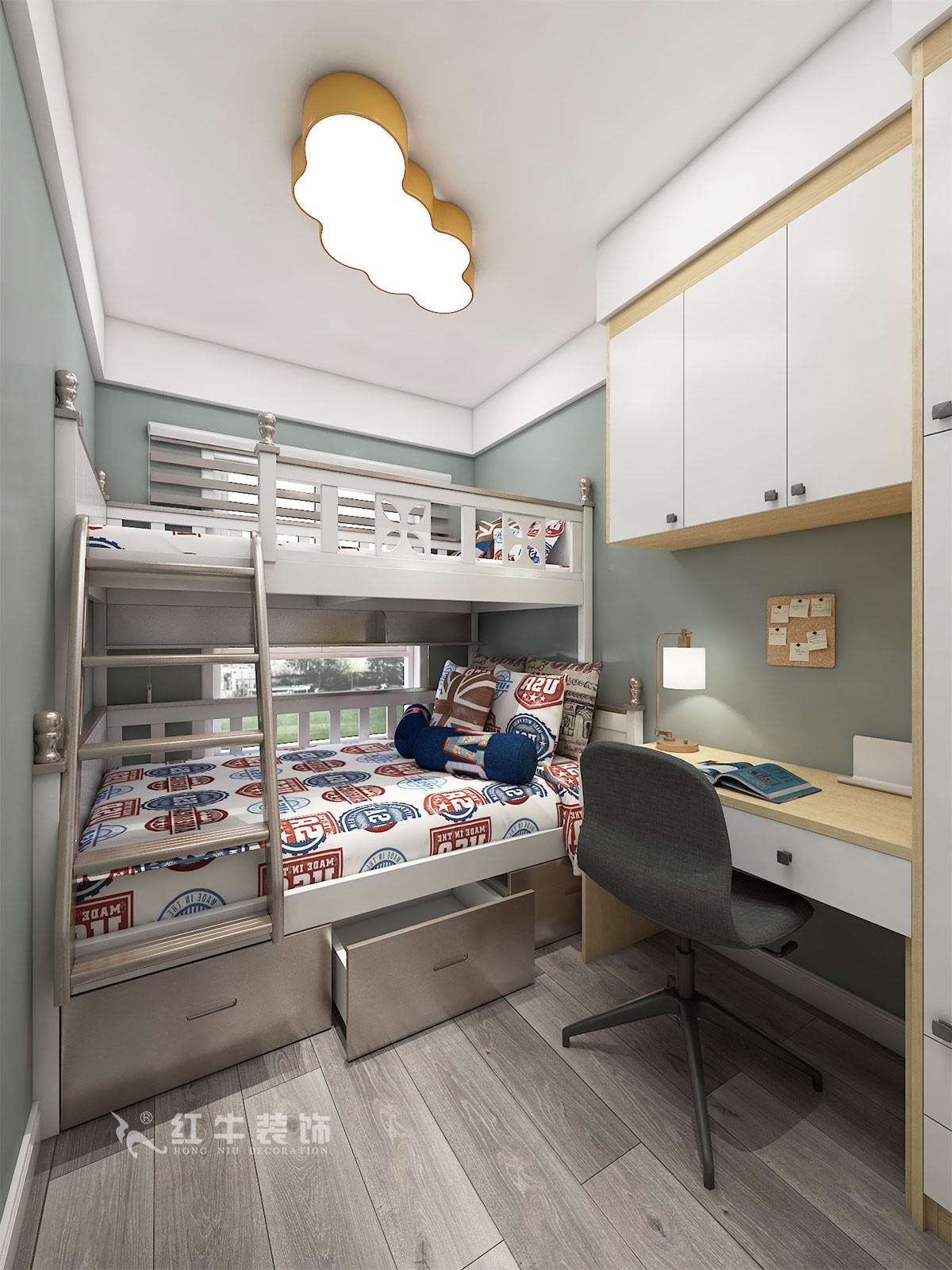 本案設(shè)計(jì)業(yè)主兩代人居住,小夫妻帶小孩居住,客廳入戶掏墻做嵌入式鞋柜,小孩房間雙層床,方便日后家里老人過來臨時(shí)居住。寫字桌跟衣柜定制,有效利用空間,增加收納。全屋木色加白門板搭配,顯得溫馨明亮。