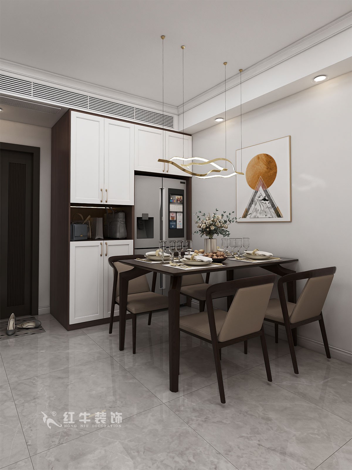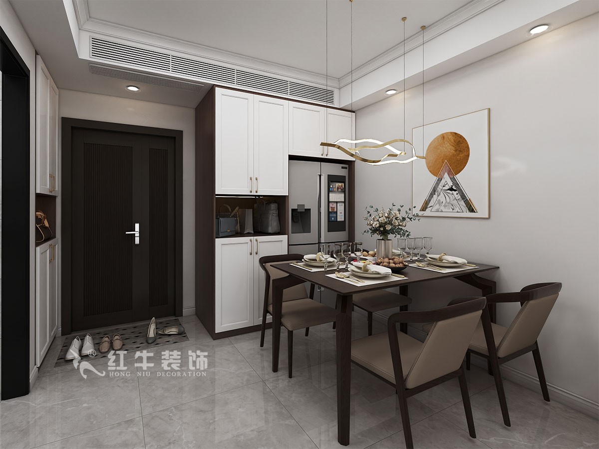 入戶(hù)門(mén)廳開(kāi)間增加餐邊柜,與冰箱齊平,即增強(qiáng)廚房空間,又提升空間儲(chǔ)藏。