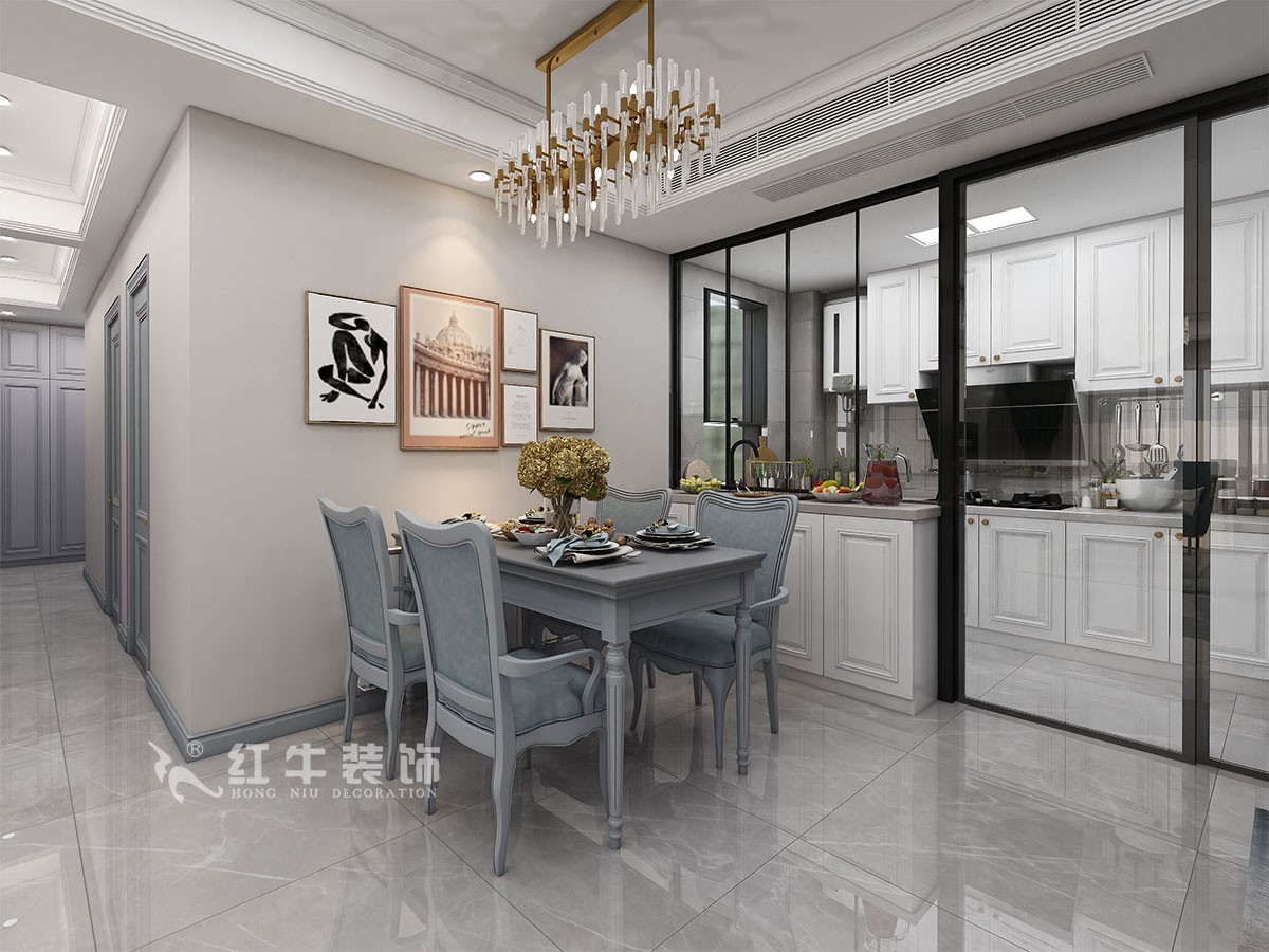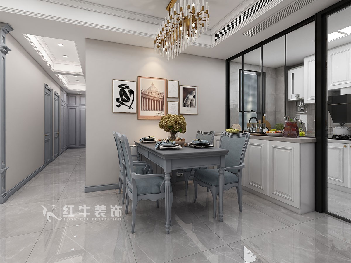 客餐廳的設(shè)計上,設(shè)計師在設(shè)計時希望能利用石材、軟包、木質(zhì)線條、金屬、玻璃所表現(xiàn)出的質(zhì)感,使其完美的呈現(xiàn)出現(xiàn)代時尚的裝飾美感。結(jié)合業(yè)主對于冷色調(diào)的喜愛,硬裝部分選擇了天藍色作為基調(diào),而軟裝部分使用墨綠色和米白色點綴,并選擇全屋淺灰色墻布融合整個客餐廳設(shè)計,軟裝設(shè)計搭配上使用水晶吊燈、金屬臺燈和金屬飾品,讓客餐廳顯得舒適協(xié)調(diào)。