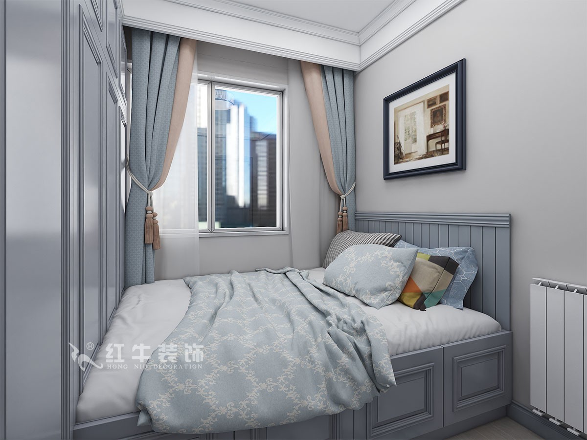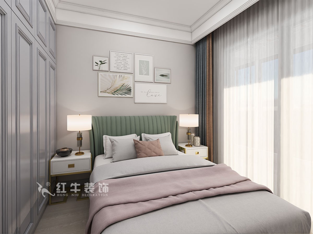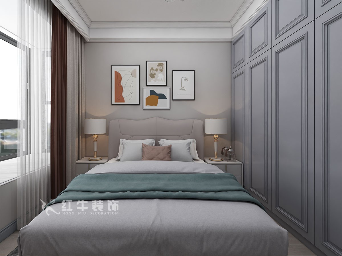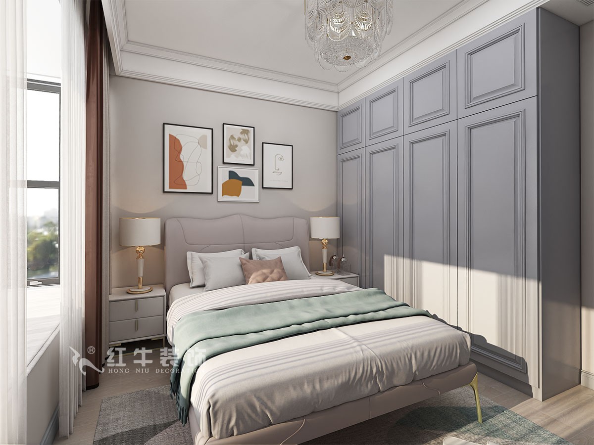 臥室的設(shè)計上,設(shè)計師選擇注重舒適氛圍的營造,在用色上講究和諧、統(tǒng)一,選擇色彩豐富的軟裝布置與冷色調(diào)的硬裝相融合,讓古典與輕奢相互碰撞,滿足業(yè)主的個性化設(shè)計需求。