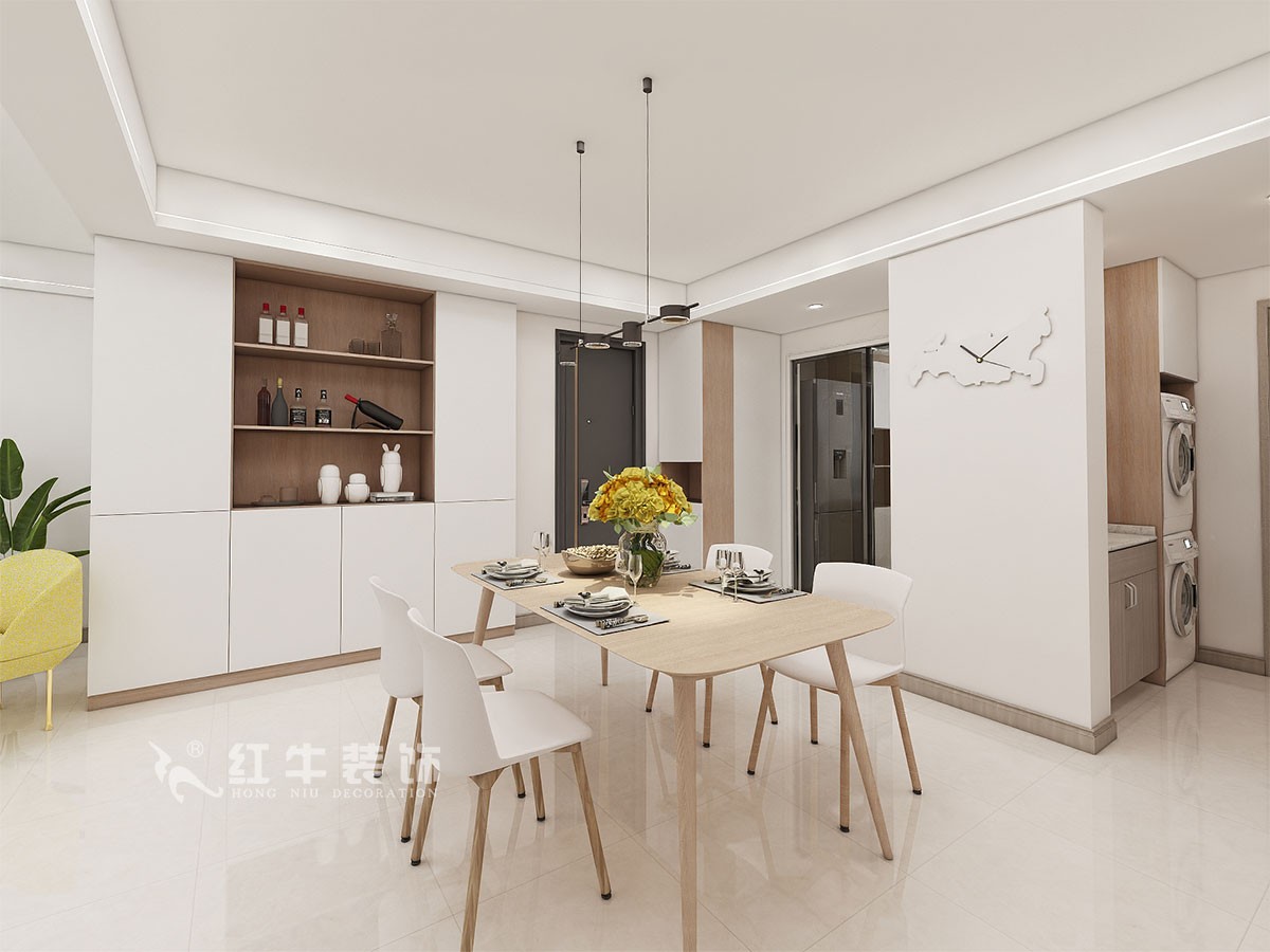 本戶型是三室二廳一衛(wèi)的戶型,整體的戶型本身已經(jīng)十分的規(guī)整,基本上結(jié)構(gòu)不需要調(diào)整改造。只是在入戶增加了鞋柜的位置。通過廚房門的改造,在入戶增加了鞋柜的位置。整體的色調(diào)采用了北歐的原木風格,白色和原木色的搭配,放大了空間的視覺效果,提升了美感。簡潔的弱化了空間的棱角,整個空間過度的更加自然。