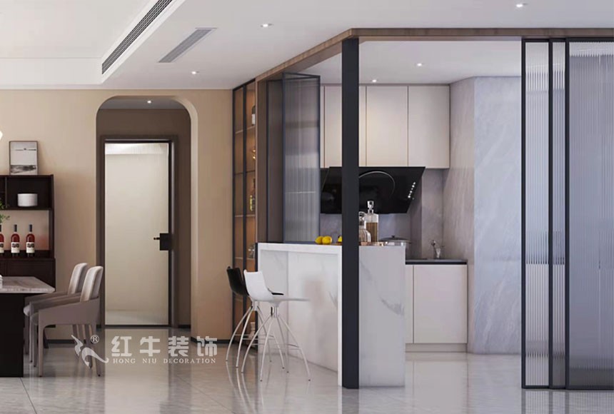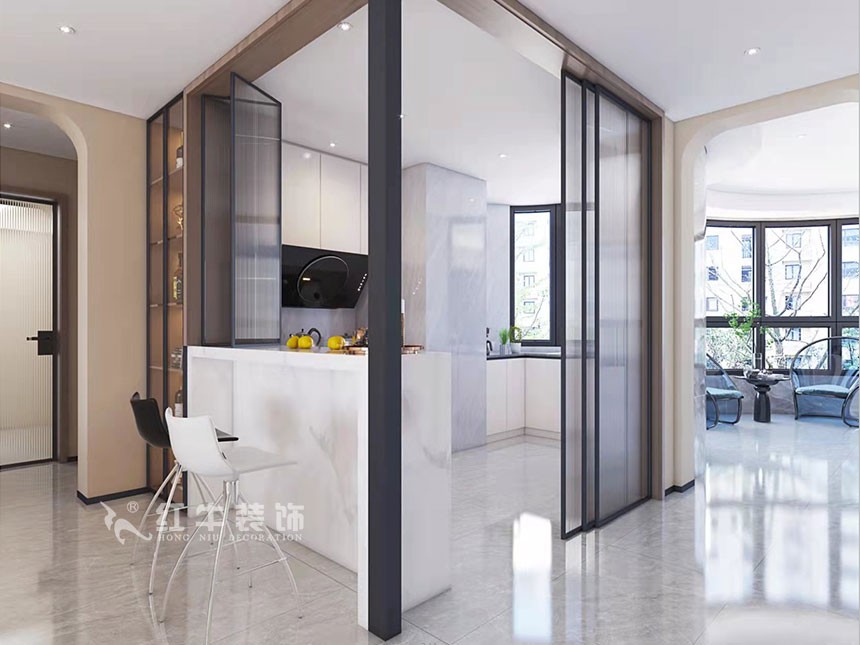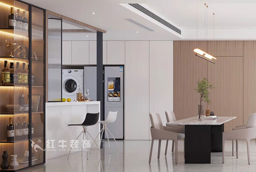 戶型方面尊重業(yè)主的意見,沒有過多調(diào)整,保留兩個衛(wèi)生間滿足同時使用的需求,減少主衛(wèi)面積打造屬于業(yè)主的衣帽間,整排的收納衣柜滿足業(yè)主的儲物需求;在餐廚空間設(shè)計上,打通廚房與餐廳的隔墻,增設(shè)一個吧臺,解決廚房窗戶狹小的問題,讓整個空間更加通透,同時增加設(shè)計的趣味性。
