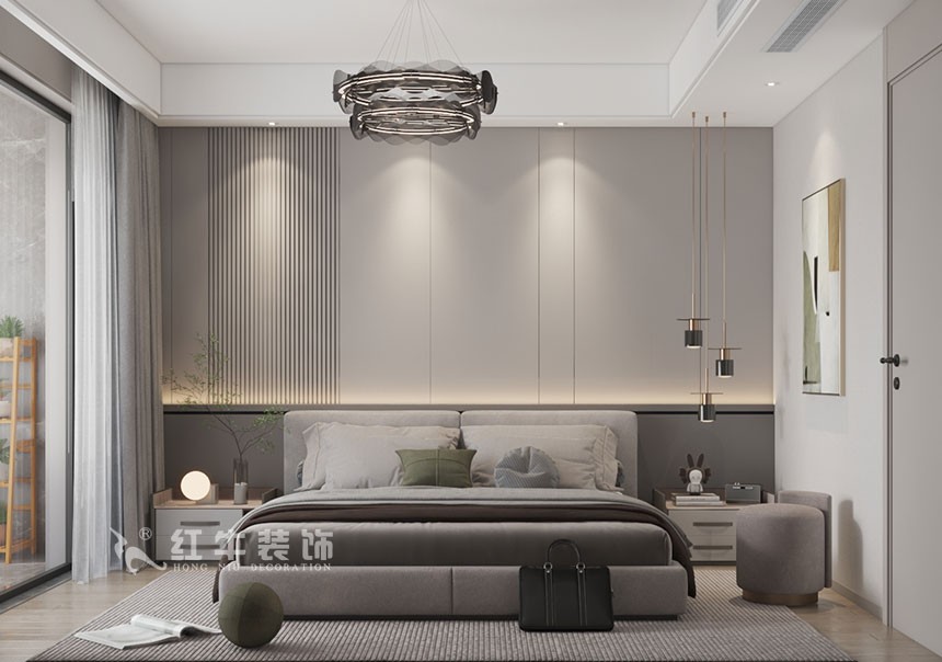 3、主臥延續(xù)了極簡風,沒有過多裝飾的床頭背景和簡單的吊線燈,整體的家具色彩搭配和諧也是用了低飽和度色和原木色的結(jié)合。