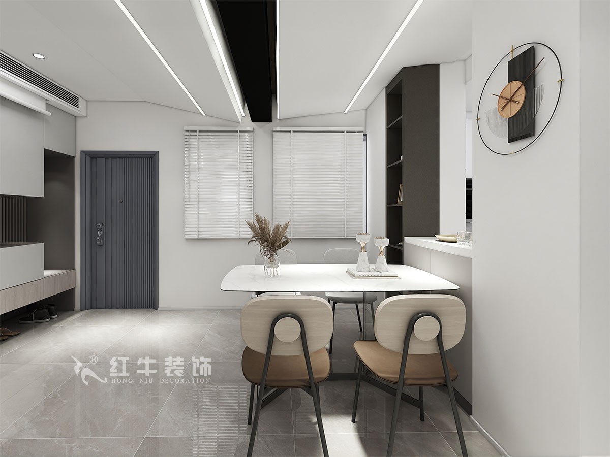 風(fēng)格主要以簡約現(xiàn)代為主。設(shè)計(jì)平面功能時(shí)通過和客戶溝通,舍棄了一個(gè)房間,那個(gè)房間光線比較暗,考慮了把空間打開,做了廚房和公共區(qū)域光線達(dá)到互通,采光也得到了解決。把進(jìn)門空間做了一個(gè)餐廳和客廳的集合,無客廳設(shè)計(jì)。進(jìn)門柜子做了功能集合,冰箱烤箱,換鞋凳鞋柜全部集合在一起,滿足客戶的基本收納功能。